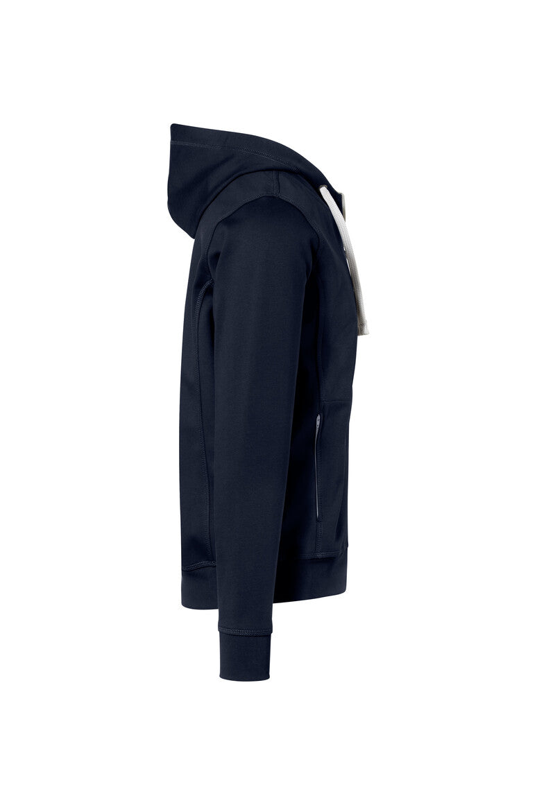 Elaborately crafted hooded jacket featuring contrast-coloured details with a soft microfleece interior. Dividing seams with flatlock stitching. High-cut hood with a silver contrast drawstring (for mottled grey: ink-coloured drawstring) and high-quality metal eyelets. Premium front zip fastener and slide-in side pockets with contrast silver zip fasteners (for mottled grey: ink-coloured zip fasteners). All zip fasteners and eyelets are by YKK®. Single jersey fleece laminate made from cotton and GRS-certified, recycled polyester. Outer layer is in fine single jersey and inner layer is in soft, contrast silver microfleece (for mottled grey: ink-coloured microfleece). Also available as a women’s model. Regular fit.